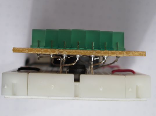 I realized that the arrangment of LEDs was not very large at all. Each LED was 5mm x 5mm. In the diamond arrangement, the full size was 35mm x 35mm, or about 1 1/2 in x 1 1/2 in. This is bigger than a IC, but not by that much. So I had an idea to simply bend the pins into an arrangement that matched the port (output) pins on the PIC. I knew that I would solder all of the cathode leads together, so I only needed to worry about the anode leads. Because the pins were going to go around the 0.300in spacing of an IC, I had to space then at 0.5in. The Sharpie marks on the bottom of the board represent where I had to line up each pin (although some of the marks are wrong).